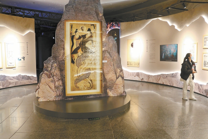 走進(jìn)展覽的第一部分,一座象征著巍巍昆侖山的模型屹立在展廳中間。古代華夏先祖被認(rèn)為與昆侖山有關(guān),孕育出女?huà)z補(bǔ)天、伏羲畫(huà)卦、夸父逐日、精衛(wèi)填海等神話故事。在模型背面,展出了新疆維吾爾自治區(qū)博物館藏唐代《彩繪伏羲女?huà)z》。這幅畫(huà)作以麻布為底,彩畫(huà)伏羲女?huà)z,上半部為人身相擁,下半部為蛇身纏繞。畫(huà)中的伏羲女?huà)z分別手持規(guī)和矩,頂部和底部中心繪有日月圖案。傳說(shuō)伏羲女?huà)z是人類的始祖神,他們的結(jié)合誕生了人類。