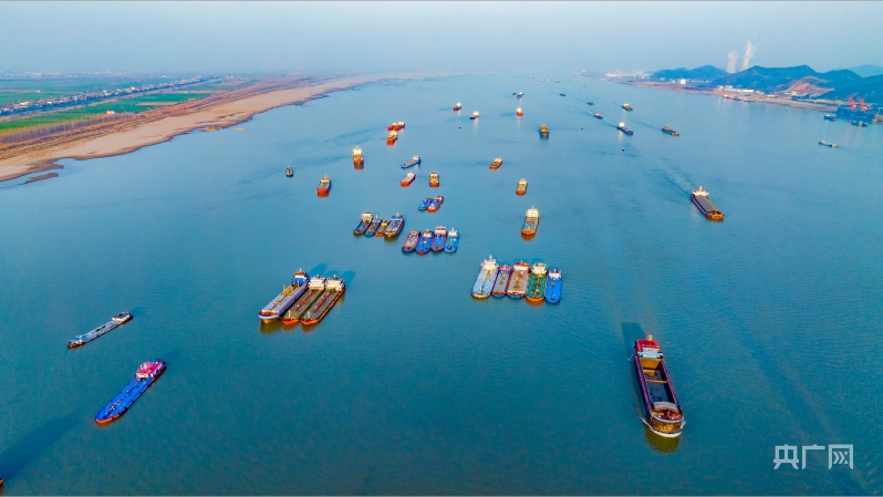 長(zhǎng)江航道江西省九江市湖口縣水域船舶往來(lái)穿梭,水運(yùn)一派繁忙(央廣網(wǎng)發(fā) 張玉 攝)