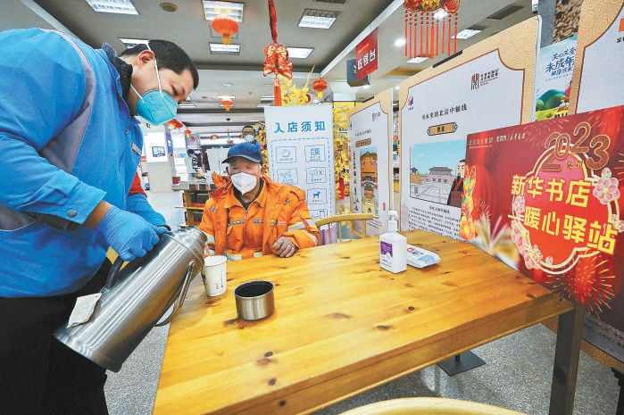 新華書店開設暖心驛站,為環(huán)衛(wèi)工人、快遞小哥等免費提供熱水和休息場所。本報記者 程功攝