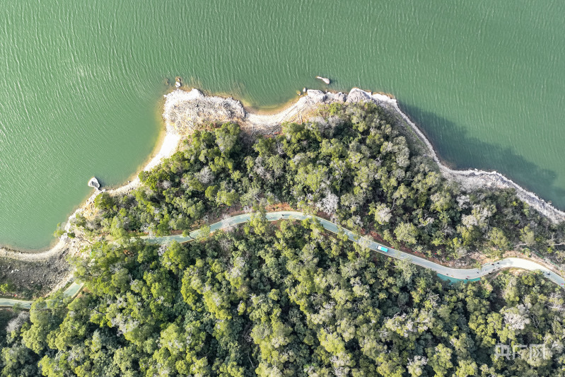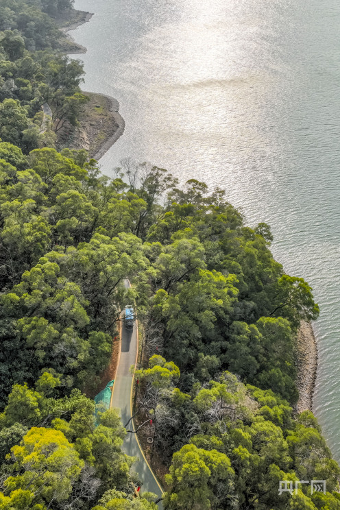 福建省福清市石竹山景區(qū)內(nèi)的東張水庫,綠樹、湖水、小島交相輝映,呈現(xiàn)一片綠意盎然的冬季美景(央廣網(wǎng)發(fā) 謝貴明 攝)