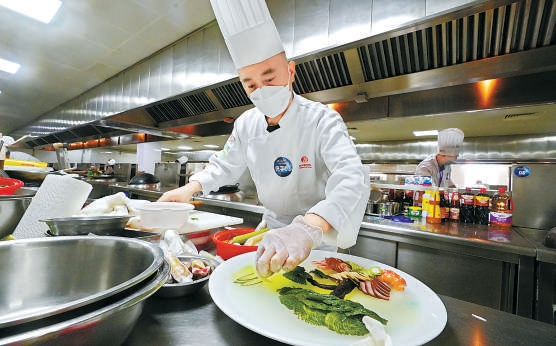 比賽開始后,首先進(jìn)行藝術(shù)冷拼制作環(huán)節(jié),規(guī)定用時1小時;隨后進(jìn)行其余熱菜,用時兩小時。“這主要是考慮到比賽的公正性,每位選手在同一時間段制作完成相同的菜品,評委統(tǒng)一品嘗、打分,避免同一菜品因出菜時間不同導(dǎo)致評委打分忽高忽低。”第三屆“北京大工匠”中式烹調(diào)師比賽裁判長侯玉瑞告訴記者,3小時制作完成4道菜品對選手來說難度不小,“平時廚師操作是有分工的,但比賽現(xiàn)場所有工序都要選手一個人完成,而且比賽時間也很緊張。通常制作一道冷拼的時間是90分鐘,這次比賽不僅操作時間短,還要求至少使用4葷3素7種食材,對食材的選料、用料,色彩搭配以及刀工要求都非常高?!焙钣袢鹫f,冷拼刀工要求食材既要切得薄,外表還要平整、不毛糙,整體擺盤要有創(chuàng)意。