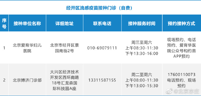 社會事業(yè)局相關(guān)負(fù)責(zé)人介紹,經(jīng)開區(qū)將繼續(xù)采用提前預(yù)約方式開展自費流感疫苗接種工作。目前,經(jīng)開區(qū)共設(shè)立北京博濟(jì)門診部、北京愛育華婦兒醫(yī)院兩個流感疫苗接種服務(wù)點,有接種需求的市民可提前向接種門診預(yù)約咨詢,可通過電話、現(xiàn)場登記、微信公眾號及其他網(wǎng)絡(luò)預(yù)約方式完成預(yù)約。