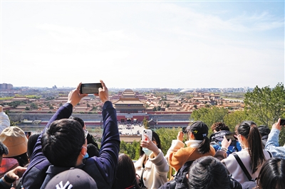 3月26日,景山公園,游客眺望遠(yuǎn)處故宮拍照打卡。新京報記者 王飛 攝