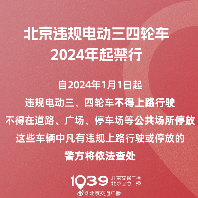 2022年,北京市共發(fā)生違規(guī)電動三、四輪車交通事故131起,死亡138人。市交管局于4月12日再次強(qiáng)調(diào),自2024年1月1日起,違規(guī)電動三、四輪車不得上路行駛,不得在道路、廣場、停車場等公共場所停放。這些車輛中凡有違規(guī)上路行駛或停放的,警方將依法查處。