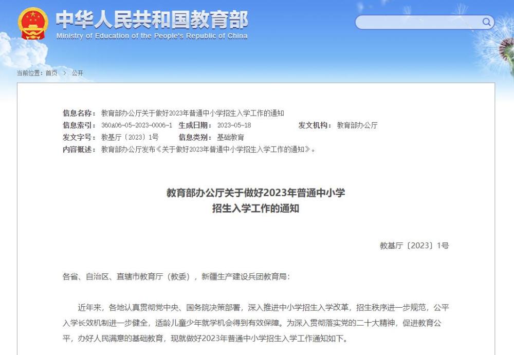 央視網(wǎng)消息:近日,教育部辦公廳發(fā)布《關(guān)于做好2023年普通中小學(xué)招生入學(xué)工作的通知》。主要內(nèi)容如下: