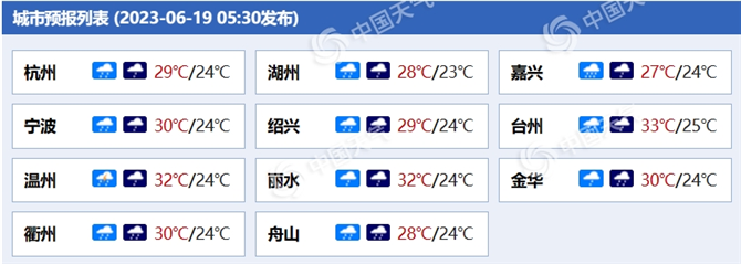 根據(jù)浙江省氣象臺(tái)預(yù)報(bào),今明兩天,浙江各地雨勢(shì)還將進(jìn)一步增強(qiáng),個(gè)別地區(qū)甚至可能有大暴雨現(xiàn)身。具體來(lái)看,今天,浙北和浙中西部地區(qū)多云到陰,上午起陰有陣雨或雷雨,部分中雨,局部暴雨;其他地區(qū)多云到陰,午后部分陰有陣雨或雷雨。最高氣溫: 浙北北部地區(qū):27-29℃; 東南沿海地區(qū):32-34℃; 其他地區(qū):30-32℃。