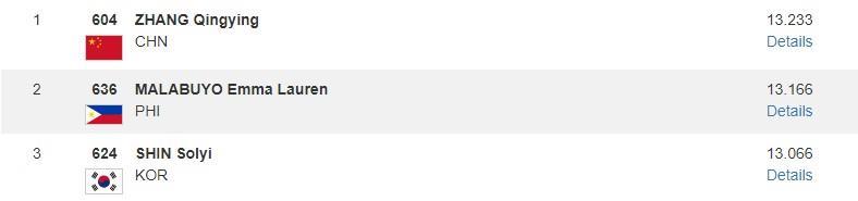 女子自由操項目,張清穎以13.233分再奪一枚金牌。另一名中國選手邱祺緣以12.133分排名第七。