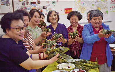 6月19日下午,什剎海街道端午節(jié)民俗活動在北京市西城區(qū)什剎海街道華方居家養(yǎng)老配餐中心舉行,30多位老人和民俗專家一起包粽子。新京報記者 李木易 攝