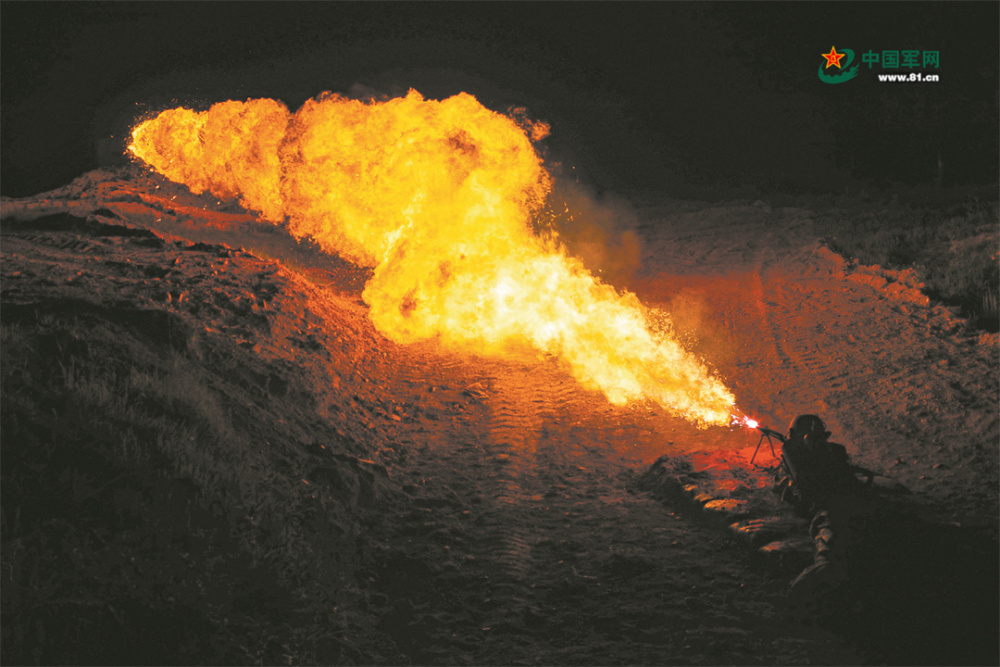 陸軍某旅組織防化分隊(duì)開(kāi)展夜間噴火器實(shí)噴訓(xùn)練。萬(wàn)智奇 攝