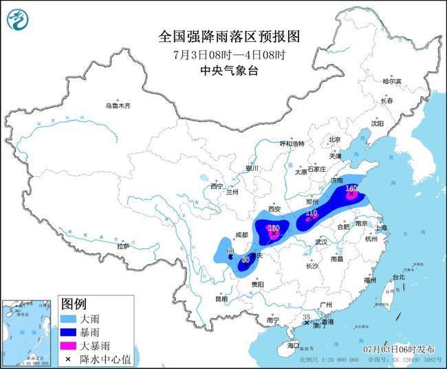 預(yù)計(jì),7月3日08時(shí)至4日08時(shí),山東中南部、江蘇北部、安徽北部、河南東部和南部、湖北北部和西部、陜西南部、重慶、四川東部、貴州西北部、云南東北部以及廣東西南部沿海等地部分地區(qū)有大到暴雨,其中,山東南部、江蘇北部、河南南部、重慶北部、四川東北部等地局地有大暴雨(100~160毫米)。上述部分地區(qū)伴有短時(shí)強(qiáng)降水(最大小時(shí)降雨量30~50毫米,局地可超過(guò)60毫米),局地有雷暴大風(fēng)等強(qiáng)對(duì)流天氣。