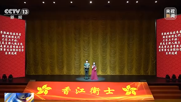 《香江衛(wèi)士》主題文藝演出舞臺上,身著紅色禮服的香港女孩黃逸晴與駐軍官兵同臺主持。黃逸晴是2015年香港大學(xué)生軍事生活體驗(yàn)營的學(xué)員,大學(xué)畢業(yè)后,她經(jīng)常從事社會公益工作,把愛國精神、奉獻(xiàn)情懷傳遞給更多人。