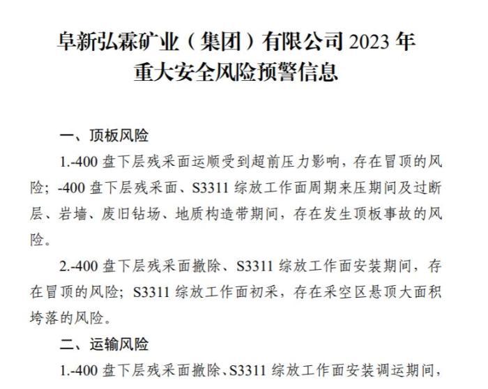2021年2月,阜新市煤炭工業(yè)轉(zhuǎn)型發(fā)展局、遼寧煤監(jiān)局遼西監(jiān)察分局就曾發(fā)布2021年平安煤礦和弘霖煤礦重大安全風(fēng)險預(yù)警信息,重大安全風(fēng)險預(yù)判清單顯示,弘霖煤礦存在“超強度、超定員組織生產(chǎn)風(fēng)險”“安全監(jiān)測監(jiān)控系統(tǒng)出現(xiàn)故障”等問題。
