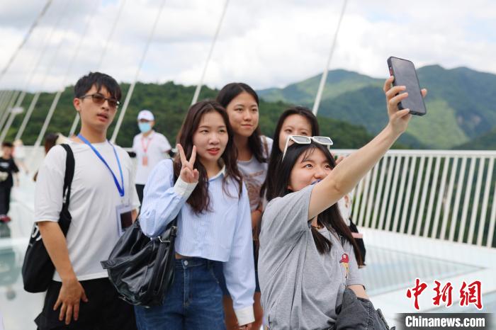 7月3日至8日,2023年全國臺聯(lián)第二十屆臺胞青年千人夏令營湖南分營舉行。圖為臺胞青年“打卡”張家界玻璃橋?!∴嵑蜐?攝