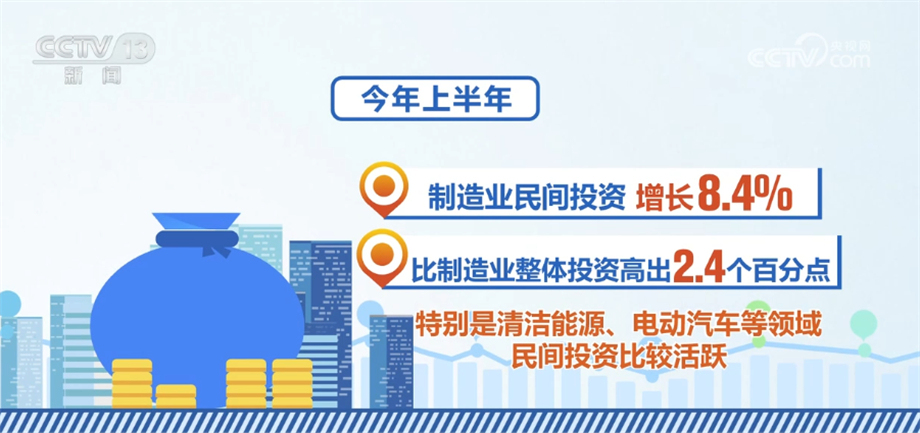 國家發(fā)展改革委相關負責人表示,當前,民間投資結(jié)構(gòu)持續(xù)優(yōu)化,一些領域民間投資顯現(xiàn)了不少亮點。今年上半年,除房地產(chǎn)開發(fā)以外的民間投資同比增長9.4%,增速比全部投資高5.6個百分點;制造業(yè)民間投資增長8.4%,比制造業(yè)整體投資高出2.4個百分點,特別是清潔能源、電動汽車等領域民間投資比較活躍;基礎設施民間投資增長15.6%,比基礎設施整體投資高出8.4個百分點,呈現(xiàn)出較強的投資信心和投資動力。