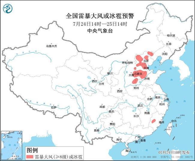 預計7月24日14時至25日14時,山西東部、河北大部、北京西部和東南部、天津中西部和南部、山東北部、河南西北部、福建西北部等地的部分地區(qū)將有8級-10級雷暴大風或冰雹天氣;黑龍江西北部、吉林中東部、遼寧北部和西南部、青海東部、甘肅西南部、陜西中東部、山西東部、河北大部、北京大部、天津、山東中北部、河南西部、江蘇中部、上海東南部、湖北西南部、湖南北部、江西中南部、浙江、福建、四川中南部、重慶、貴州北部、云南中南部、廣東東北部、海南島西南部、臺灣島東部等地的部分地區(qū)將有短時強降水天氣,小時雨量30-50毫米,局地可達70毫米以上。