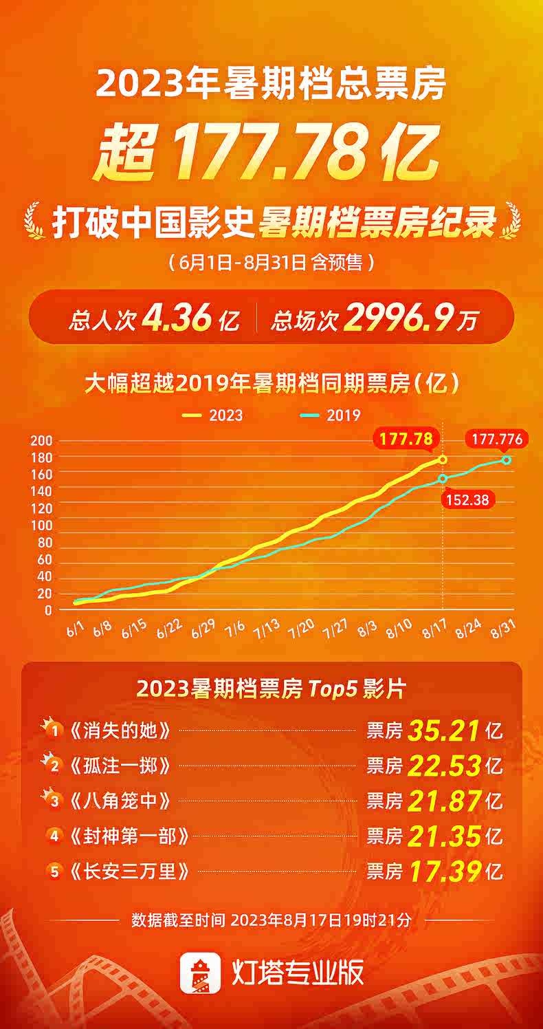 央廣網(wǎng)北京8月17日消息 據(jù)燈塔專業(yè)版數(shù)據(jù),截至8月17日19時21分,2023年暑期檔總票房超177.78億,打破中國影史暑期檔最高票房紀錄,目前距離暑期檔結束還有14天。