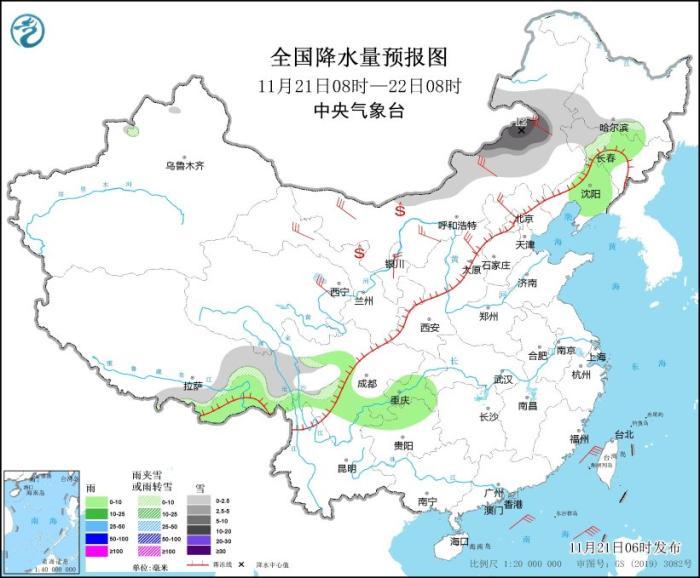 11月21日08時至22日08時,內(nèi)蒙古東部、黑龍江西南部、吉林西部等地部分地區(qū)有小到中雪或雨夾雪,其中,內(nèi)蒙古東部局地有大到暴雪(10~12毫米)。吉林中部、遼寧大部、西藏東南部、四川盆地南部、重慶大部、貴州北部、云南東北部等地部分地區(qū)有小雨。西北地區(qū)中部和東北部、內(nèi)蒙古大部、華北西部和北部等地部分地區(qū)有4~6級風(fēng)。內(nèi)蒙古河套地區(qū)、甘肅河西等地局地有揚(yáng)沙(見圖6)。