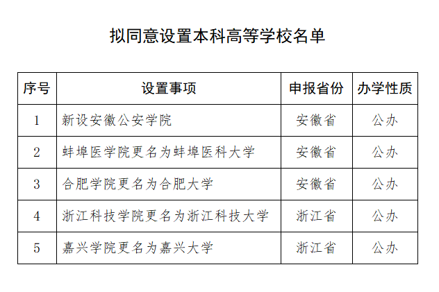 根據(jù)《中華人民共和國高等教育法》《普通高等學(xué)校設(shè)置暫行條例》《普通本科學(xué)校設(shè)置暫行規(guī)定》有關(guān)規(guī)定以及第八屆全國高等學(xué)校設(shè)置評議委員會考察評議結(jié)果,經(jīng)教育部黨組會議審議,擬同意設(shè)置安徽公安學(xué)院等5所學(xué)校,現(xiàn)予公示。公示時間為2023年11月20日至11月24日。