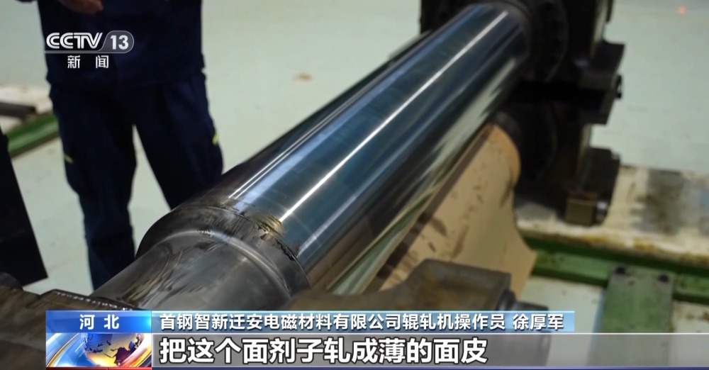 首鋼智新遷安電磁材料有限公司輥軋機(jī)操作員 徐厚軍:這就是軋制和帶鋼直接接觸的工作輥,如果說(shuō)家里搟面的話,這就是我們的搟面杖。那個(gè)鋼鐵材料就相當(dāng)于面劑子,我們就用這個(gè)搟面杖,通過(guò)擠壓,把這個(gè)面劑子軋成薄的面皮。6個(gè)搟面杖串起來(lái),一遍就軋出來(lái)了。生產(chǎn)效率比傳統(tǒng)生產(chǎn)方法高了8倍到10倍,這條機(jī)組軋制速度是1500米每分鐘,相當(dāng)于高速公路上以時(shí)速90公里開(kāi)的小車一直在跑。