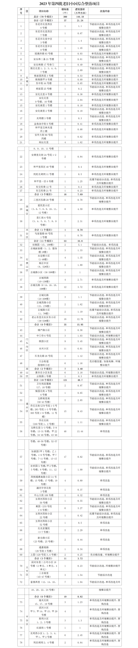 今年北京市第四批老舊小區(qū)綜合整治項(xiàng)目涉及東城、西城、豐臺(tái)、石景山、門(mén)頭溝、大興、房山、通州、平谷9個(gè)區(qū),各項(xiàng)目改造內(nèi)容根據(jù)小區(qū)居民改造意愿確定,主要包括危舊樓改建、抗震節(jié)能綜合改造、節(jié)能綜合改造、單項(xiàng)改造及環(huán)境整治提升等方面。