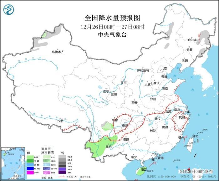 圖1 全國降水量預報圖(12月26日08時-27日08時)