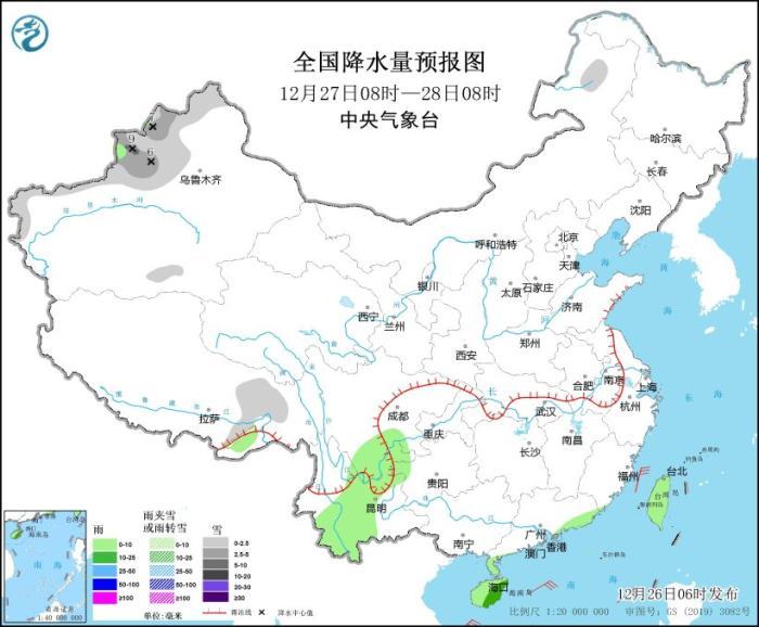 12月27日08時至28日08時,內蒙古東北部、新疆北部和南疆西部山區(qū)、西藏東部等地部分地區(qū)有小到中雪或雨夾雪,其中,新疆北疆北部和伊犁河谷等地部分地區(qū)有大雪(5~9毫米)。云南中部、廣東東南部沿海、海南島、臺灣島等地部分地區(qū)有小到中雨(見圖2)。