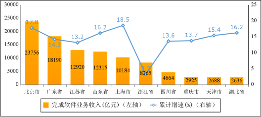主要軟件大省收入占比持續(xù)提升。1—11月份,軟件業(yè)務(wù)收入居前5名的省份中,北京市,廣東省,江蘇省,山東省,上海市軟件收入分別為23756億元、18190億元、12920億元、12315億元和10184億元,分別增長17.8%、14.2%、13.2%、16.2%和18.5%,五?。ㄊ校┖嫌嬡浖I(yè)務(wù)收入77365億元,占全國比重為70%,占比較去年同期提高1.2個百分點。
