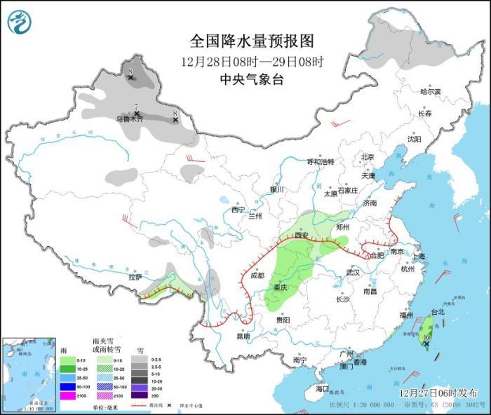 12月28日08時(shí)至29日08時(shí),新疆北部、內(nèi)蒙古東北部、黑龍江西北部、西藏東南部、陜西中部等地部分地區(qū)有小雪或雨夾雪,其中,新疆沿天山地區(qū)和北疆北部等地部分地區(qū)有中到大雪(5~8毫米)。陜西南部、河南南部、西南地區(qū)東部、臺(tái)灣島等地部分地區(qū)有小到中雨,其中,臺(tái)灣島東部和南部等地部分地區(qū)有大雨(25~40毫米)。青海西部、甘肅河西、內(nèi)蒙古中部等地部分地區(qū)有5~6級(jí)風(fēng)(見圖2)。