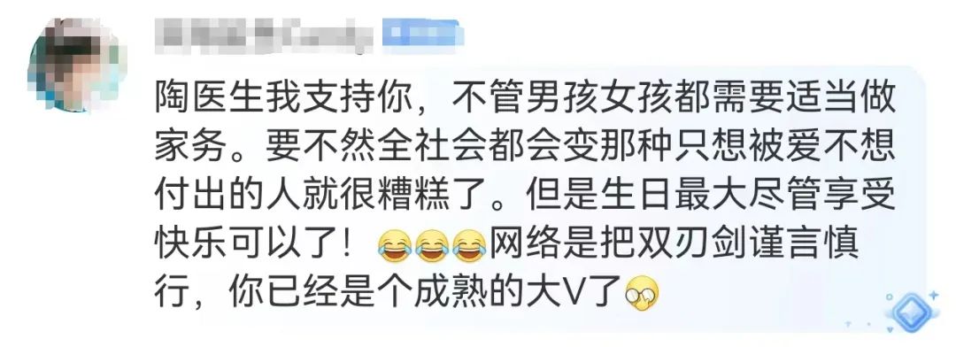 一部分網(wǎng)友認(rèn)為表達(dá)了對(duì)陶勇醫(yī)生的支持:“不管男孩女孩都需要適當(dāng)做家務(wù)”“玉不琢不成器”。