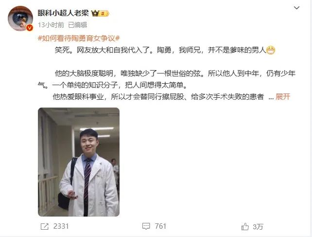 12月24日深夜,擁有超330萬(wàn)粉絲的醫(yī)生大V“眼科小超人老梁”發(fā)長(zhǎng)文力挺陶勇,稱他是自己的師兄,并不是爹味的男人。文中提到: