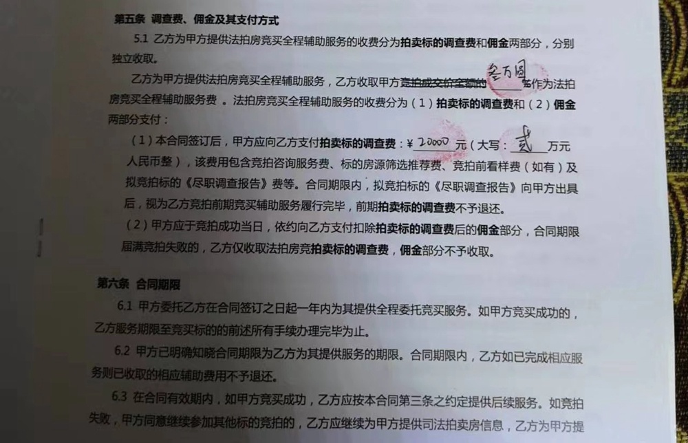 最終,中介口中30萬出頭就可以拿下的房子,被加價到了39萬,李先生放棄了競拍。他算了一筆賬,按最終成交價再加上各種費(fèi)用,這套法拍房不低于同戶型的二手房價格。房子沒拍到,之前交的兩萬元“調(diào)查費(fèi)”也打了水漂。在李先生給記者提供的雙方合同中,有這樣的約定:“合同期限內(nèi),擬競拍標(biāo)的《盡職調(diào)查報告》向甲方出具后,視為乙方競拍前期競買輔助服務(wù)履行完畢,前期拍賣標(biāo)的‘調(diào)查費(fèi)’不予退還”。