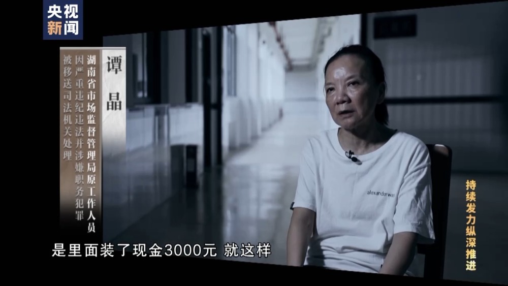 湖南省市場(chǎng)監(jiān)督管理局原工作人員 譚晶:他就拿了一個(gè)信封,在沒人的地方他就悄悄塞給我,他說是我們單位的資料。然后我回去以后發(fā)現(xiàn)是里面裝了現(xiàn)金3000元,就這樣。所以我不逃避我自己的(責(zé)任),犯了法要承擔(dān)法律的責(zé)任,一定要。
