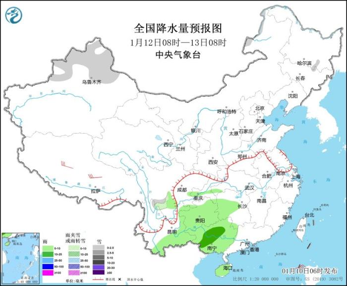 1月12日08時(shí)至13日08時(shí),新疆北疆北部、川西高原南部等地部分地區(qū)有小雪或雨夾雪。四川盆地南部、湖南西部、貴州、云南東部和南部、廣西、海南島等地部分地區(qū)有小到中雨。西藏中部部分地區(qū)有5~6級(jí)風(fēng);南海東部和西南部等海域有6~7級(jí)風(fēng)、陣風(fēng)8級(jí)。
