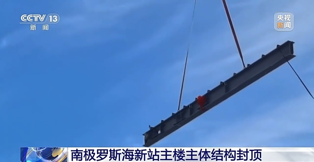 總臺(tái)央視記者 李寧:這里就是南極羅斯海新站的建設(shè)現(xiàn)場(chǎng),現(xiàn)在正在進(jìn)行吊裝作業(yè)的就是新站主樓的最后一根鋼梁。為了慶祝這個(gè)重要的工程節(jié)點(diǎn),隊(duì)員們給這根鋼梁戴上了大紅花。隨著這根鋼梁的成功吊裝,標(biāo)志著羅斯海新站的主樓主結(jié)構(gòu)完成了封頂。