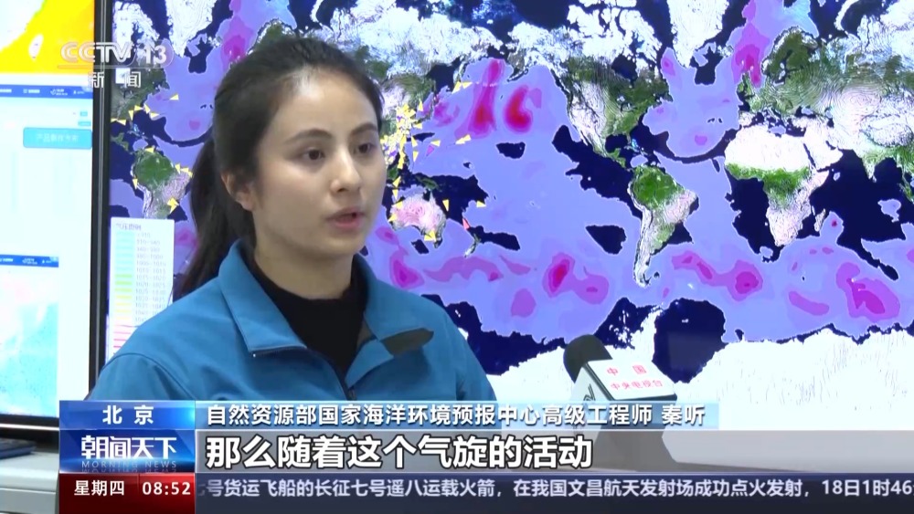 自然資源部國家海洋環(huán)境預(yù)報中心高級工程師 秦聽:那么隨著這個氣旋的活動,就會造成這種南半球的中低緯度的暖濕氣流,與南極的冷氣團之間的碰撞,所形成的這種極地的降雪,以及海霧這種低能見度的一個情況,并且會引起它作業(yè)海區(qū)的一個大風(fēng)、海浪的這種高海況天氣。