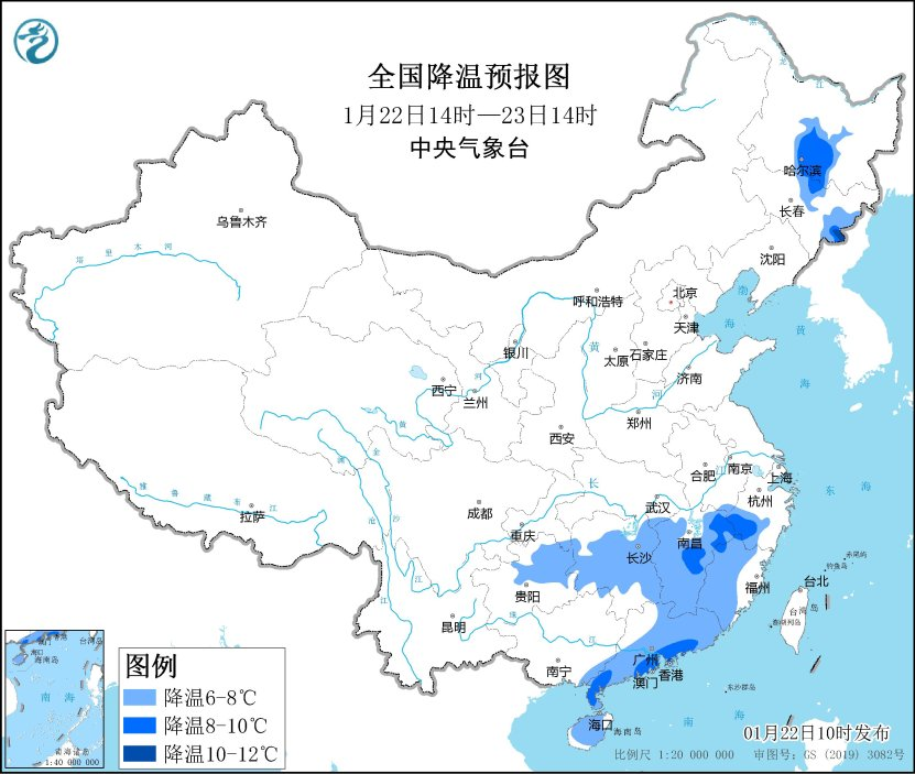 受寒潮影響,預計,1月22日14時至1月23日14時,黑龍江中部、吉林中東部、貴州東部、湖南中南部、江西、浙江西部、福建中西部、廣東東部和南部等地將降溫6~8℃,局地降溫超過9~10℃。23日至24日,最低氣溫0℃線將南壓到廣西北部和廣東北部一帶,江南、華南北部、貴州等地的最低氣溫可達-8~-1℃,華南中南部可達0~8℃。