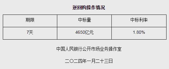 中新網1月23日電 據央行網站消息,為維護銀行體系流動性合理充裕,2024年1月23日人民銀行以利率招標方式開展了4650億元逆回購操作,中標利率1.80%,期限為7天。具體情況如下: