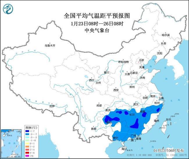 中央氣象臺1月23日06時繼續(xù)發(fā)布低溫藍(lán)色預(yù)警:預(yù)計,1月23日至25日,貴州、湖南、江西、浙江中南部、福建西部、廣東、廣西中東部等地最低氣溫或平均氣溫較歷史同期偏低5℃以上,其中,貴州中東部、湖南西北部、江西中南部、浙江南部、廣東西北部等地的部分地區(qū)偏低7℃以上,最低氣溫0℃線將位于廣西北部、廣東北部一帶 。