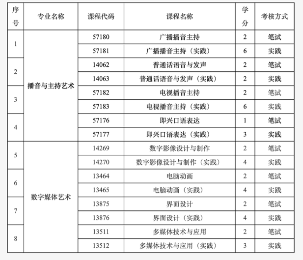 3. 調(diào)整播音與主持藝術(shù)專業(yè)(專升本)、數(shù)字媒體藝術(shù)專業(yè)(專升本)2個專業(yè)中8門課程(見下表),筆試和實踐均納入到“非筆試及實踐類課程”進行報考,由主考學(xué)校組織考試。
