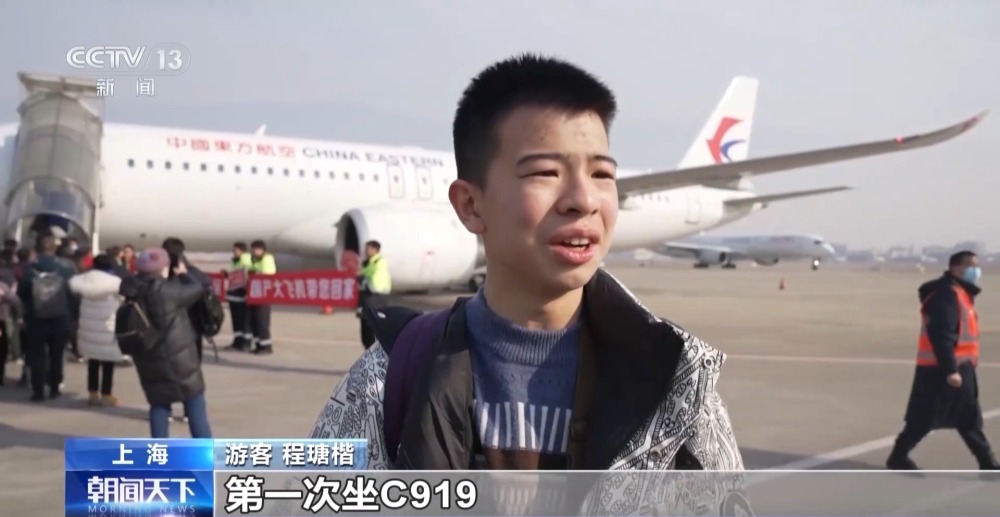 游客 程瑭楷:實在是太激動了,第一次坐C919,因為這是我們自己研發(fā)的飛機,它的流線型結構,還有起落架、引擎,真的太漂亮了。