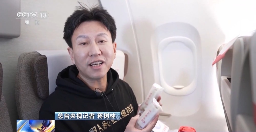 總臺央視記者 蔣樹林:首先是這個大白兔的紅豆風味的牛奶,這還是我頭一次看到這樣的口味。還有這個桂花條頭糕,是上海老字號出產(chǎn)的??梢哉f這個小小的餐盤把上海的土特產(chǎn),搬到了C919飛機上。