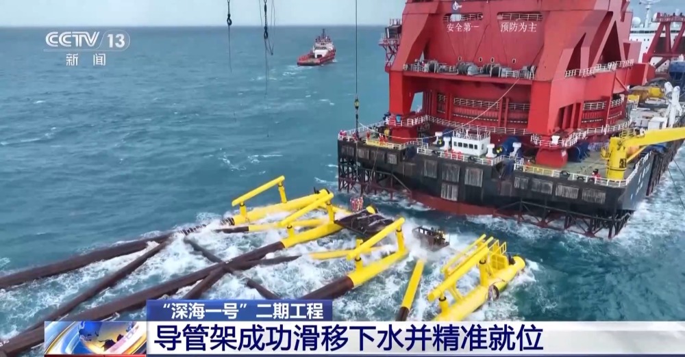 中國海油“深海一號”二期工程導管架海上安裝首席 黎世龍:“深海一號”二期工程導管架海上安裝采用滑移下水方式進行。這種方式是利用導管架自身重力并配合液壓千斤頂助推,使導管架從駁船平穩(wěn)地滑入海中,再通過起重船將導管架吊裝扶正坐底,從而實現(xiàn)安裝就位。