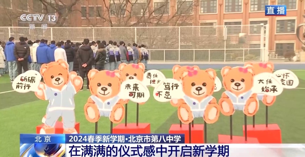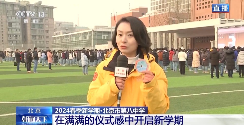 總臺央視記者 李晶晶:北京市第八中學(xué)高中部,近2300名高中生齊聚國旗下,舉行新學(xué)期的第一次升旗儀式,在滿滿的儀式感中開啟新的學(xué)習(xí)生活。今年是龍年,有句祝福語叫“龍行龘龘,前程朤朤”,現(xiàn)在正在進(jìn)行的國旗下的演講,題目就是《龘龘朤朤間是向上的力量》,老師祝福學(xué)生們像龍一樣騰飛而上,同時也是鼓勵他們要有夢想,為實現(xiàn)夢想不斷努力向上。
