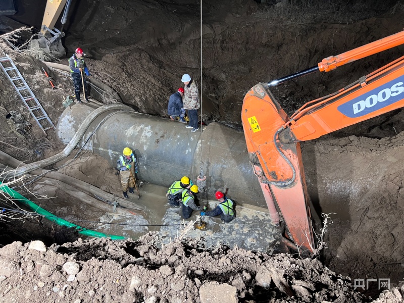 張文偉說:“因?yàn)檫@個管道是個兩米直徑的供水管線,是個主管線,它破裂以后水量特別大。管線是在耕地上,維修車輛是進(jìn)不去的。維修首先得修筑施工通道,所有車輛人員靠近不了,然后關(guān)閘停水,走施工通道過去以后,進(jìn)行原有管道抽排,管道里都是滿水,必須把水排干凈才能搶修,才能發(fā)現(xiàn)它是哪兒壞了,我們采取哪種方式來進(jìn)行搶修。搶修方案有很多種,我們也提前都有預(yù)案。所以抽水時間很長,上游就有7萬多立方的水,抽排就是一個很大的難點(diǎn)。”