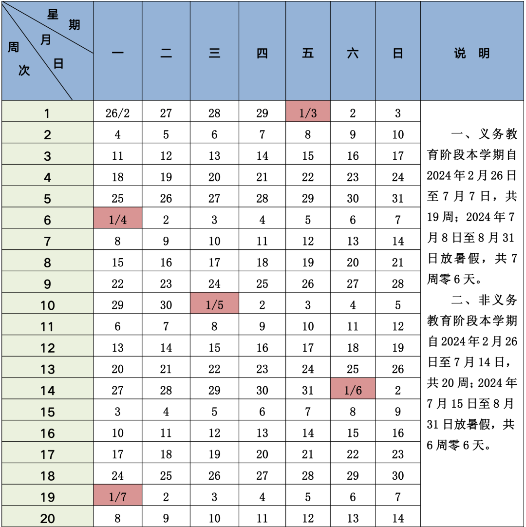 非義務教育階段第二學期于2024年2月26日(星期一)開學;2024年7月14日(星期日)結束本學期工作,共20周;2024年7月15日(星期一)至8月31日(星期六)放暑假,共6周零6天。