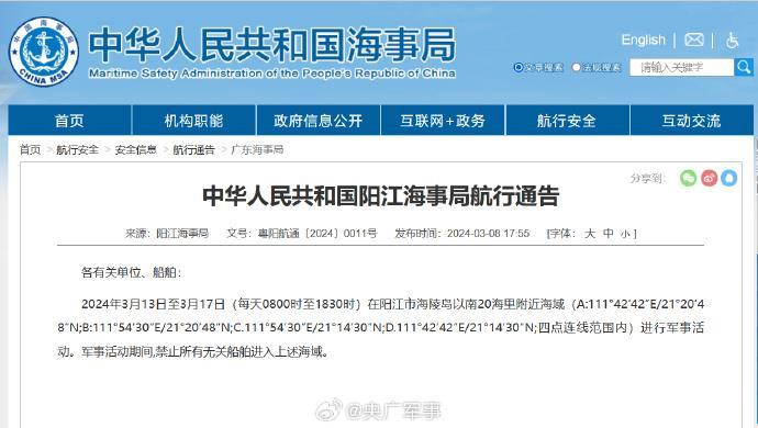 陽江海事局發(fā)布航行警告,3月13日至3月17日,每天8時至18時30分,在陽江市海陵島以南20海里附近海域進(jìn)行軍事活動,禁止駛?cè)搿?/p>