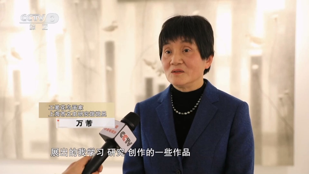 工筆花鳥畫家 上海市文史研究館館員 萬芾:實際上展覽的這個時間度是跨越了有四十多年,展出的我學習、研究、創(chuàng)作的一些作品。我是和策展人一起商量,把自己從學習到成為一個女性藝術(shù)家這個經(jīng)歷做一個梳理,以及我畫的一些跨界的一些創(chuàng)作,甚至還有我和學生合作的一些衍生品,這是三個部分,完全不一樣的內(nèi)容來展現(xiàn)給大家。