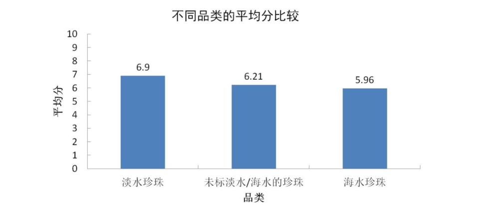 ?、壅渲轱椘菲奉?lèi)比較:對(duì)購(gòu)買(mǎi)樣品按產(chǎn)品分類(lèi)進(jìn)行橫向打分比較,平均得分由高至低分別為:淡水珍珠6.9分、珍珠(未標(biāo)識(shí)淡水或海水)6.21分、海水珍珠5.96分。