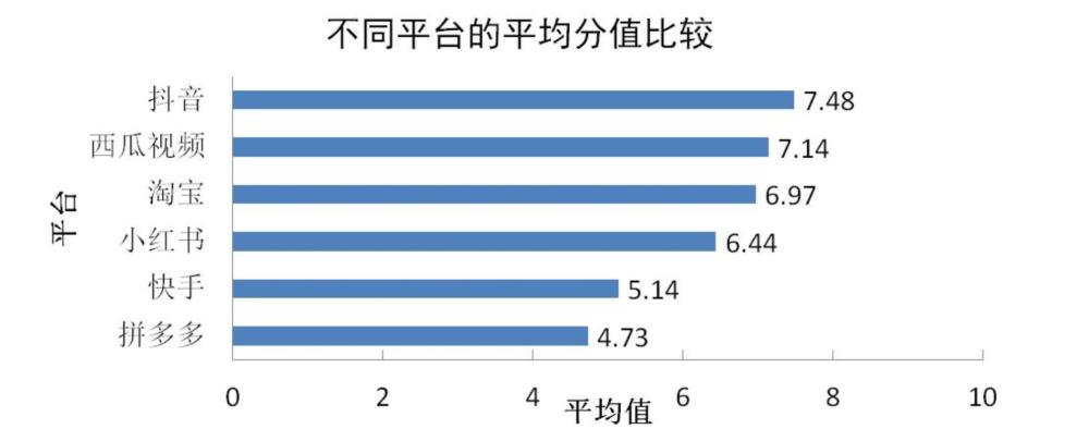 ?、倨脚_(tái)比較:本次調(diào)查對(duì)買(mǎi)樣數(shù)超過(guò)五件的平臺(tái)進(jìn)行橫向打分比較,平均得分由高至低分別為:抖音7.48分、西瓜視頻7.14分、淘寶6.97分、小紅書(shū)6.44分、快手5.14分、拼多多4.73分。