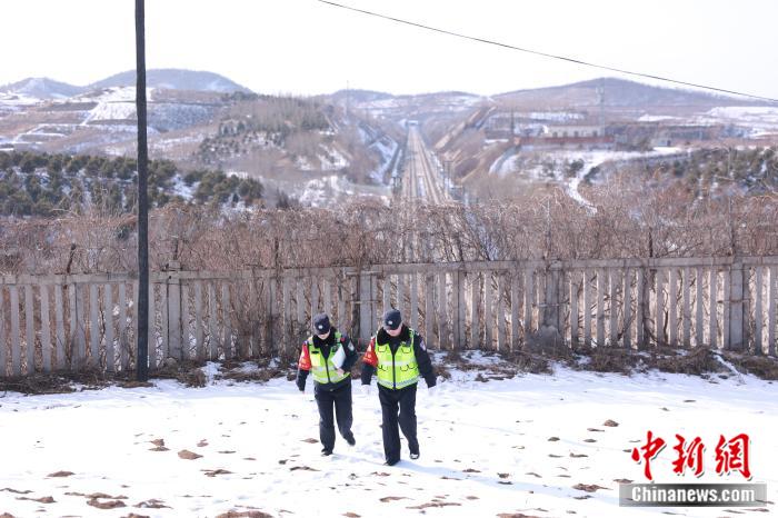 春運期間,灤河站派出所的老杜帶領(lǐng)小郭踏雪巡線。 劉建 攝